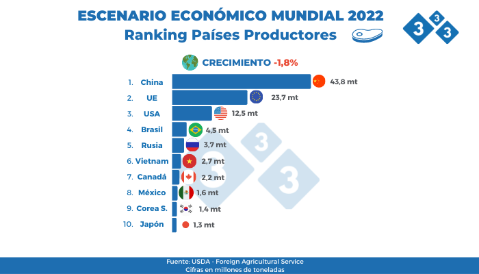 El primer lugar del ranking mundial de los productores de carne de cerdo en 2022 estaría ocupado por China, con una participación del 42% dentro del total general, esto a pesar de que se estima una disminución de 4.9% en su volumen de producción respecto a 2021, la cual pasaría de 46 mt a 43.8 mt en su orden (Gráfico 3).