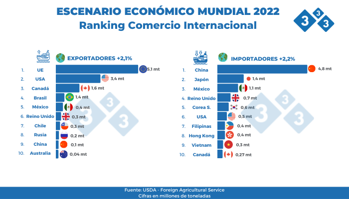 En segundo lugar, tendríamos a la Unión Europea, con una participación de 22.7%, mientras que Estados Unidos ocuparía el tercer lugar, participando con el 12%. Para este último, se espera que su volumen de producción disminuya un 0.3% frente a 2021, pasando de 12.6 a 12.5 mt respectivamente.