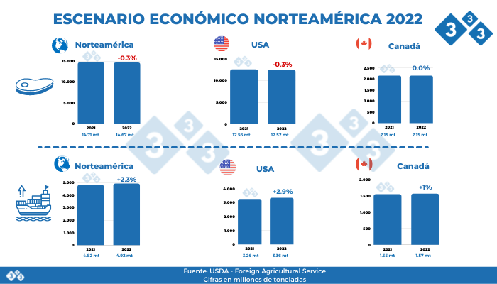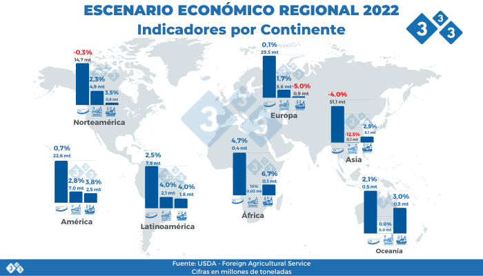 En cuanto al total de América, tenemos que la producción crecería un 0.7% frente a 2021, alcanzando 22.6 mt. Mientras que para el al comercio internacional, tendríamos incrementos del 2.8% en exportaciones y de 3.8% en importaciones, con volúmenes que se ubicarían en 7 y 2.5 mt respectivamente. Vale la pena aclarar que el crecimiento de la producción estaría jalonado por Latinoamérica, ya que para Estados Unidos se estima una disminución en este indicador.