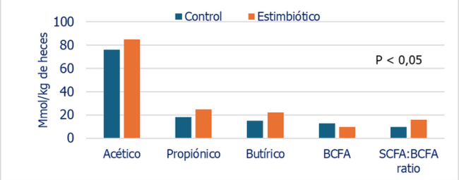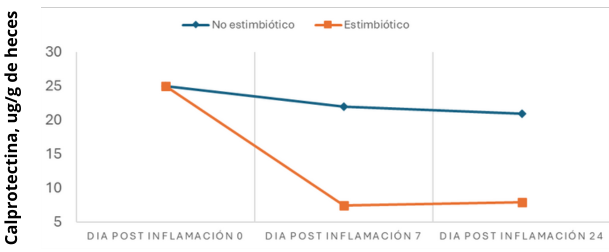 Inflamación: el desafío elevó marcadores proinflamatorios como TNF-α, IL-6 y calprotectina ileal. El estimbiótico redujo significativamente estos marcadores (P < 0,06), mostrando que atenúa la inflamación típica de una infección por ETEC.