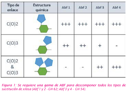 Las ABFs pertenecen a diferentes familias GH GH43, 51, 54, 62,… y son capaces de liberar arabinosa a partir de xilosas mono o di-sustituidas en oligo o polisacáridos (Figura 1; De La Mare et al., 2015). Además, la principal característica de las ABFs es tener un pH óptimo de acción enzimática más bajo que las endoxilanasas. La consecuencia directa en el tracto digestivo es que la acción desramificante ocurre en la parte superior (estómago) mientras que las endoxilanasas actuarán más abajo a lo largo del tracto digestivo.