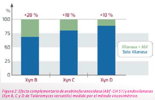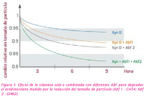 De esta manera, además de un amplio espectro de diferentes xilanasas que actúan a lo largo del tracto digestivo, en diferentes pHs; se requiere una gama de enzimas desramificadoras, como las arabinofuranosidasas (ABFs) para aumentar de manera eficaz y eficiente la liberación de nutrientes en dietas maíz/soya, muy comunes en América Latina.