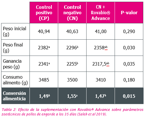 Saleh et al. (2019) demostraron los efectos en parámetros zootécnicos de pollos de 35 días alimentados con dietas basadas en maíz y soya suplementadas con Rovabio® Advance, uno complejo multienzimático (CME) que contiene enzimas desramificadoras.