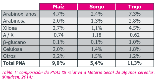 Entre los cereales destinados a la nutrición animal, el maíz y el trigo son los más utilizados. Las paredes celulares de los tejidos externos del grano contienen principalmente celulosa y xilanos complejos, junto con una cantidad significativa de lignina. Por el contrario, en el endosperma, las paredes celulares contienen casi exclusivamente arabinoxilanos (AX) y b-glucanos.