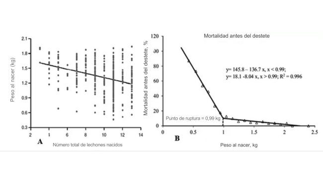 Figura 2. Relación entre el peso al nacer y el número de lechones nacidos totales (A; Vázquez-Gómez et al., 2020). Relación del peso al nacer con la mortalidad en el pre-destete (B; Zeng et al., 2019).