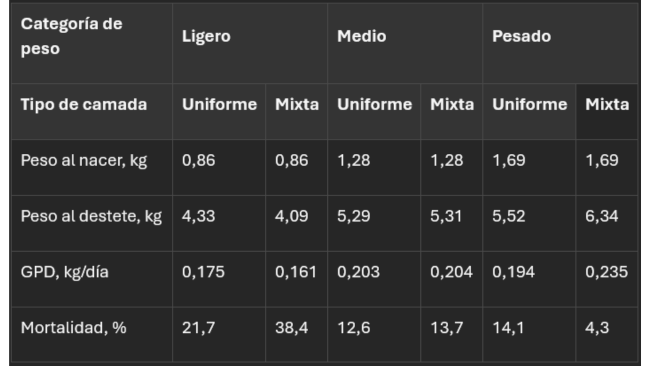 Tabla 2. Rendimiento productivo de lechones en diferentes rangos de peso al nacer, en camadas uniformizadas o mixtas (Adaptado de Vande Pol et al., 2021b).