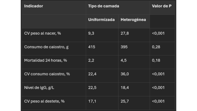 A pesar de esto, las camadas que pasaron por el proceso de uniformización demuestran claramente resultados más consistentes de consumo de calostro y reducción en la tasa de mortalidad pre-destete, conforme se muestra en la Tabla 3, con un aumento en el consumo de calostro del orden del 5% y consecuente aumento del 22% en la concentración de inmunoglobulina (IgG) en los lechones. Esta combinación resulta en una reducción de 5,5 puntos porcentuales en la mortalidad pre-destete y un coeficiente de variación del peso al destete 8,6 puntos porcentuales menor que en camadas no uniformizadas.