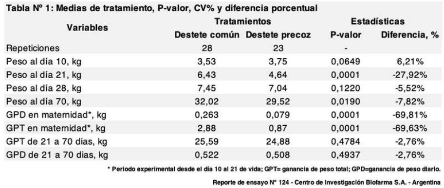 Cuando observamos el periodo de 21 a 28 días de vida (datos no publicados), los lechones destetados precozmente tuvieron 236% mayor GPD que el grupo "destete común" el cual sufrió el ya conocido freno de crecimiento al destete, que se observa en nuestra producción en mayor o menor medida independientemente al sistema de producción utilizado;