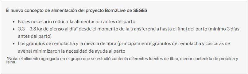 Pruebas recientes de la Universidad de Aarhus y SEGES Innovation han demostrado que alimentar a sus cerdas con 3,3 – 3,8 kg de alimento por día desde el traslado a la unidad de parto (al menos 3 días antes del parto) y hasta el parto aumenta el número de lechones nacidos vivos en un 1,7 %.