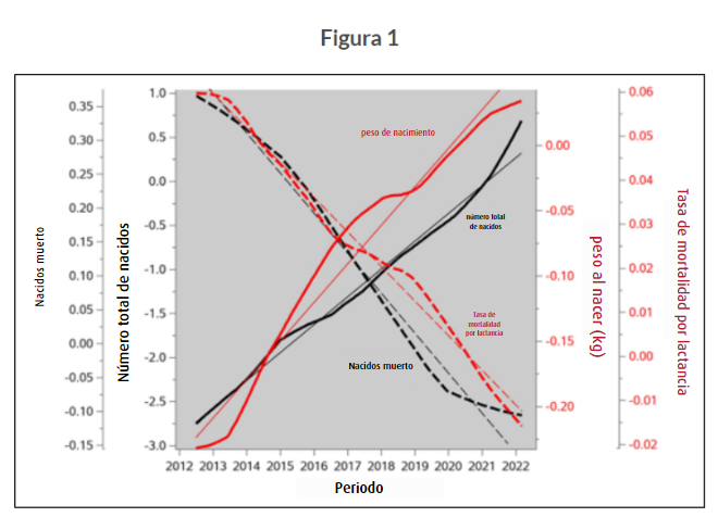 Tendencias genéticas en el tiempo del tamaño de la camada (número total de nacidos), nacidos muertos, tasa de mortalidad por lactancia y peso de los lechones al nacer en las líneas maternas de 2012 a 2022: Knap et al., (2023).