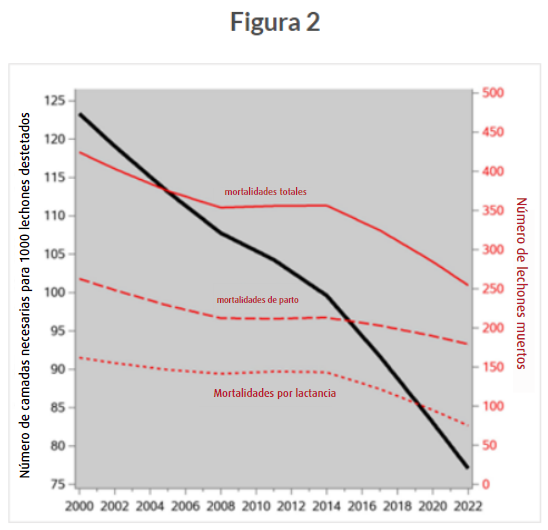 Tendencias temporales del número de camadas necesarias para producir 1.000 lechones destetados y el número asociado de lechones muertos, según los patrones del número total de nacidos y la tasa de mortalidad en parto y lactancia: Knap et al., (2023).