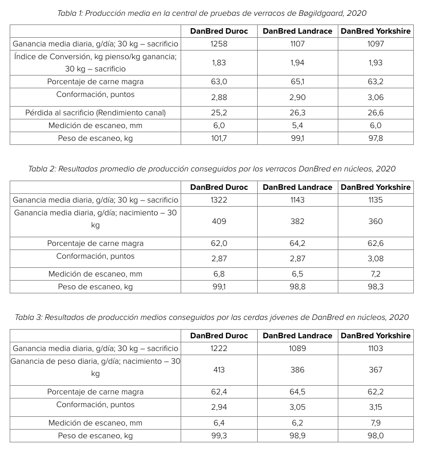 En las tablas a continuación, puede encontrar los datos de rendimiento más recientes del Duroc DanBred, Landrace DanBred y Yorkshire DanBred del año 2020, que, entre otros logros, registra aumentos en la ganancia media diaria y mejoras en el índice de conversión, contribuyendo aún más a la sostenibilidad y rentabilidad de los reproductores DanBred.