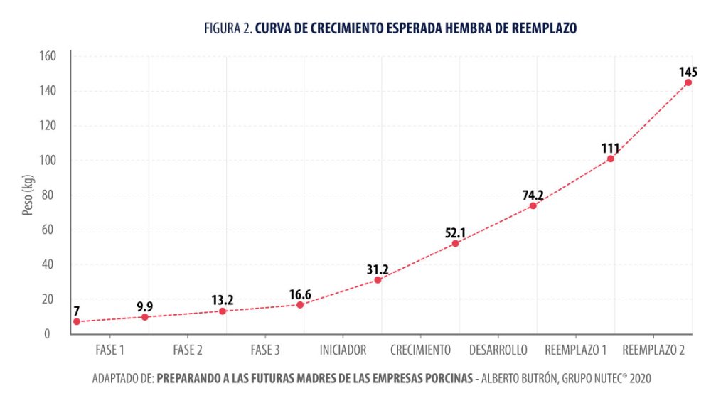 Las primerizas deben ser inseminadas con un peso objetivo de 135 a 150kg y dos celos registrados, si pesan menos de 135kg tienen menos lechones nacidos en un total de tres partos que las primerizas que pesan más de 135kg como se muestra en la figura 2 (Williams et al., 2005). Alcanzar el peso deseado permite alcanzar la masa corporal adecuada en el primer parto (>180 kg) asumiendo un aumento de peso de la camada de 35 a 40 kg durante la primera gestación (Patterson y Foxcroft, 2019).