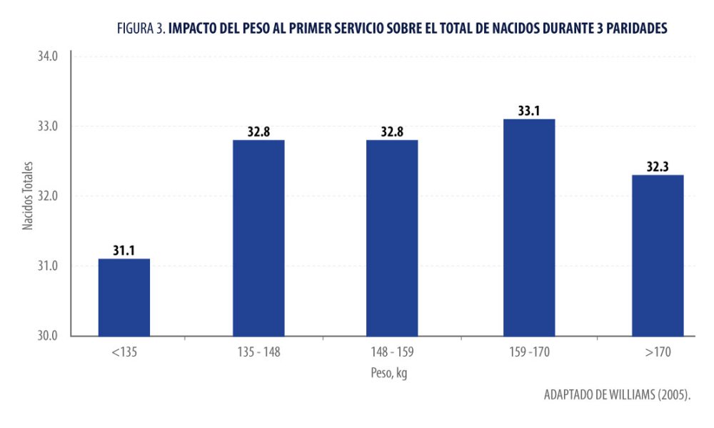 En el estudio de Kim et al., (2016) se evaluó la relación del peso corporal de las primerizas y la eficiencia en los siguientes partos, en el que se correlacionó que las hembras primerizas que son servidas por encima de los 165kg disminuyen su consumo en la primera lactancia y pierden mayor porcentaje de peso en maternidad. A su vez las hembras servidas de más de 180kg aumentaban el riesgo de disminuir su tasa de retención, y una mayor incidencia de problemas locomotores como causa de descarte, aumentando los lechones nacidos muertos y disgalactia postparto (Dourmad et al., 2001). Williams et al., en 2005, reportaron que la cantidad de nacidos totales está relacionada con el peso a servicio, encontrando mejor desempeño, entre 135 - 170kg, y con al menos dos estros registrados (Figura 3).