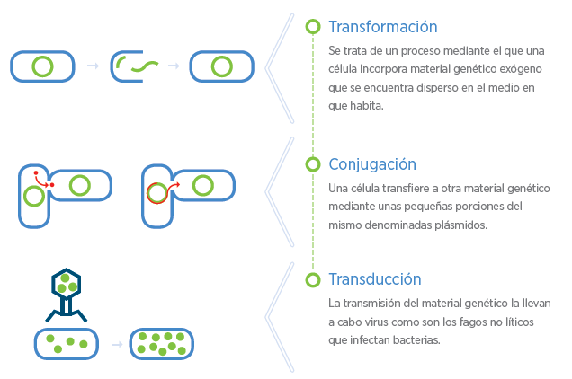 En el primer caso de resistencia adquirida, los cambios genéticos se pueden producir por mutaciones espontáneas. Aunque lo más común es el intercambio de material genético que contiene genes de resistencia entre diferentes microorganismos. Estos intercambios se pueden producir por varios mecanismos: