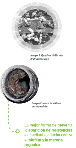La causa más habitual de aparición de resistencia, y fallos en la desinfección, es la persistencia de restos de materia orgánica y el desarrollo de biofilm por parte de los microorganismos y la protección que este les confiere.