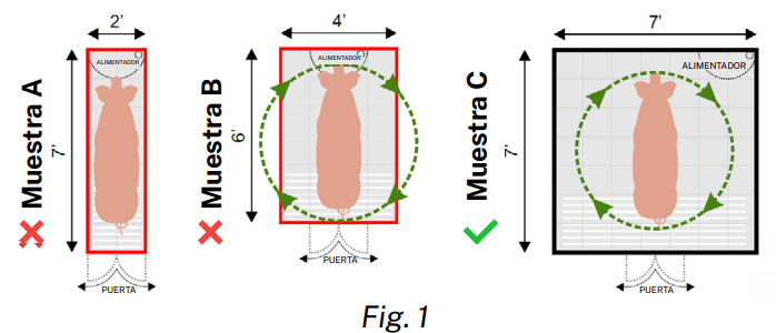 • Un recinto deberá proporcionar un mínimo de 24 pies cuadrados de superficie útil por cerdo reproductor.