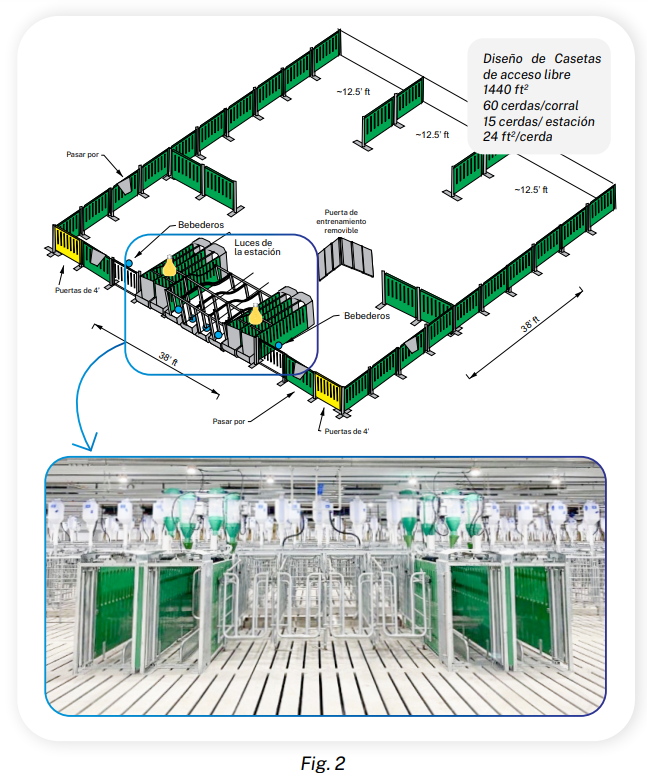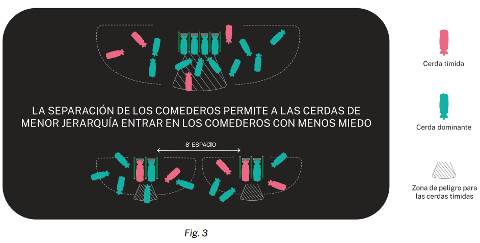 MAXIMUS coloca estaciones ESF dobles al menos a 8 pies de distancia, siempre que sea posible, al diseñar corrales de alojamiento grupal (ver Fig. 2). Al hacerlo, esto ayuda a acomodar la alimentación de las cerdas de jerarquía inferior en el corral durante el período de alimentación de 24 horas. Ayuda a evitar que las cerdas dominantes protejan las estaciones de alimentación. A las cerdas tímidas les gusta tener la capacidad de acercarse a todas las estaciones de alimentación, desde múltiples ángulos, sin sentirse amenazadas por las cerdas más dominantes. Esto se ilustra en la imagen de abajo (Fig. 3).