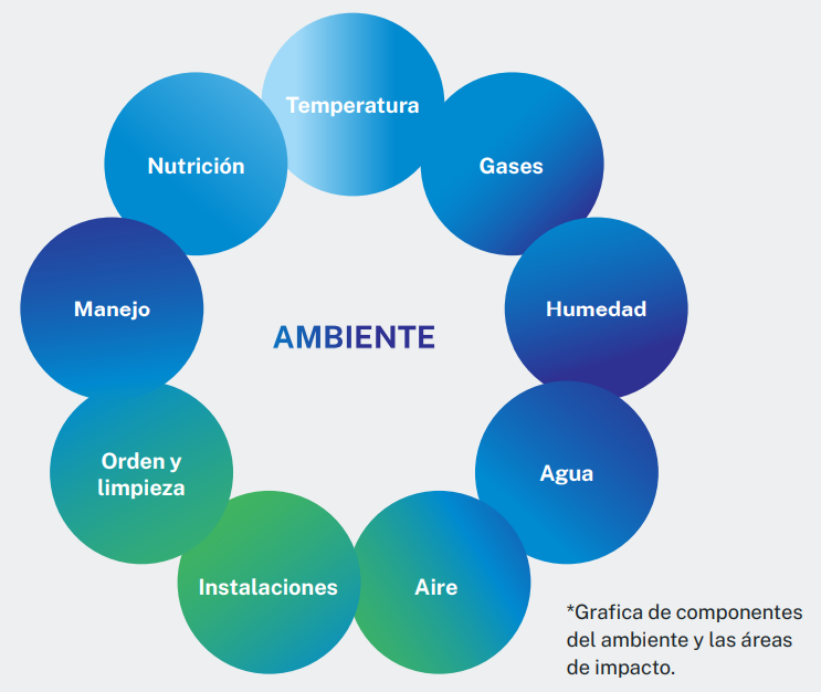 El principio básico de ambiente debe ser mitigar los factores de estrés y garantizar el bienestar de los animales. Para esto es necesario conocer y controlar a los parámetros que forman parte del ambiente, como temperatura, calidad del aire, densidad poblacional, instalaciones, nutrición, etc.