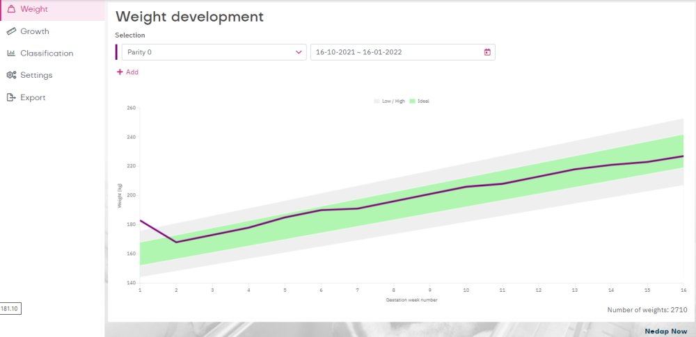 Condition of sows is important. Good condition is given more productivity (piglets born alive). This can be done with Back Fat measurement/Calliper and other tools. Weighing would be suitable but takes too much time. Now Nedap did automate this. This is done every day automatically. On a 1700 sow farm, we have 2710 automatic week weights in 3 month, not dependent on your personal, is this not incredible.