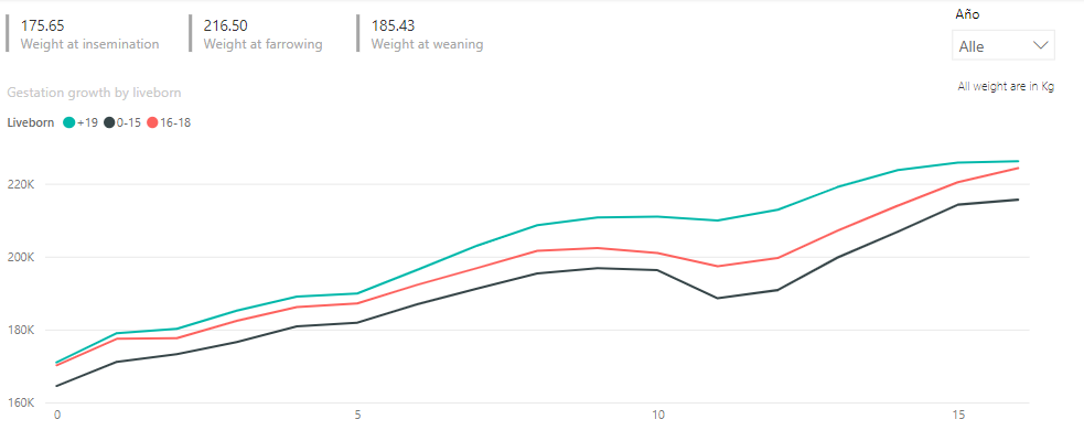 One of the analyses done is shown in the graph below, you see the growth of the gilts in pregnancy and her production of liveborn piglets.