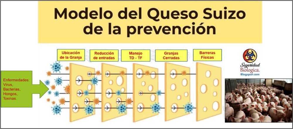 Trasladado a la bioseguridad porcina, en nuestras granjas, aplica perfectamente este modelo, ya que no existe ningún sistema de bioseguridad perfecto por sí mismo, pero mediante el uso de este método, el riesgo puede reducirse al mínimo posible.