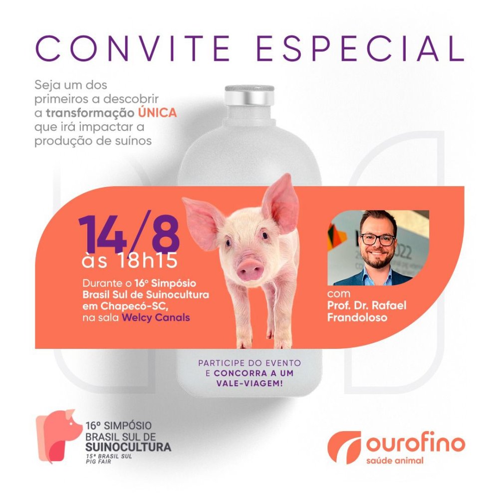 Diante disso, a Ourofino Saúde Animal é patrocinadora do evento e apresentará no dia 14/08 ás 18:15 hs, na Sala Welcy Canals com o professor Rafael Frandoloso uma transformação única para a suinocultura.