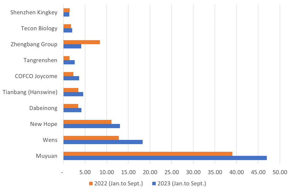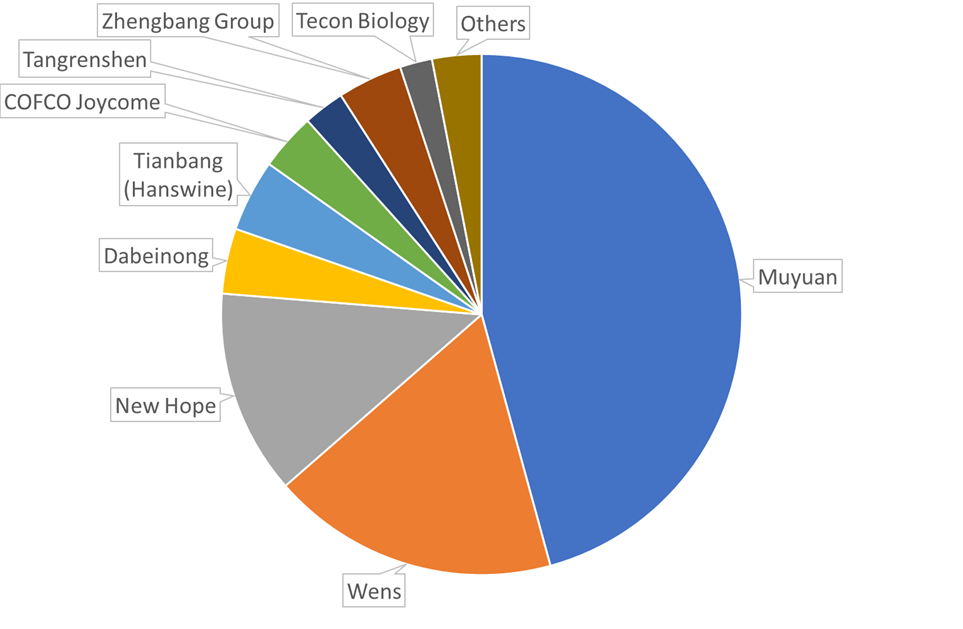 Las 50 principales empresas productoras de cerdos tienen una producción total de alrededor de 250 millones de cerdos y, de enero a septiembre, 13 empresas sacrificaron un poco más de 100 millones de cerdos (ver Figura 1). Los 3 primeros (Muyuan, Wens y New Hope) representan el 76% de ese total.