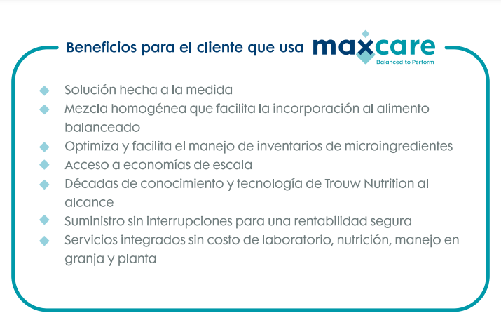 Hablar de MaxCare de Trouw Nutrition es hablar de la integración de una premezcla a la medida con una serie de servicios de valor agregado dirigidos al cliente.