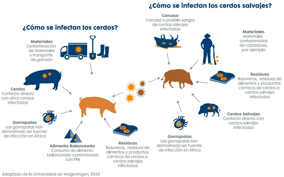 Cuando se evaluaron los factores de riesgo asociados a la transmisión de la PPA Niederweder (2021) reporto que las principales vías de ingreso del virus de la PPA a los países afectados se debieron a falencias en la bioseguridad de los países. Los países afectados no pudieron controlar adecuadamente la introducción de cerdos infectados con PPA, evitar el contacto con cerdos comerciales con jabalíes infectados, evitar el uso de embutidos o subproductos porcinos en la alimentación de los cerdos. Todo esto aunado al riesgo que representa la logística mundial de materias primas con la PPA. En el mundo interconectado que vivimos, los commodities como el maíz, trigo, pasta de soya y colina normalmente recorren medio mundo antes de llegar a nuestros puertos y finalmente a nuestras granjas en forma de alimento balanceado. Desafortunadamente, esto sobrepone un riesgo latente para la transmisión de la PPA, debido a que el virus de la PPA tiene la capacidad de sobrevivir durante todo el transito transatlántico (Niederwerder, 2021).