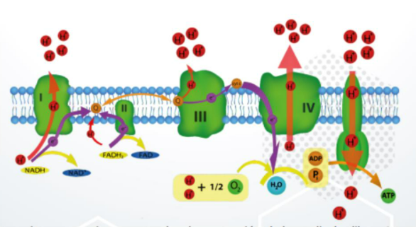 Este es un proceso redox que tiene lugar en la membrana mitocondrial interna. Las enzimas que catalizan estas reacciones crean un gradiente de protones (H+) a través de la membrana. Aunque el transporte electrónico es muy eficiente, un pequeño porcentaje de electrones se escapa de manera prematura al O₂, dando lugar a la formación del radical libre (radical superóxido), el cual es tóxico para las células.