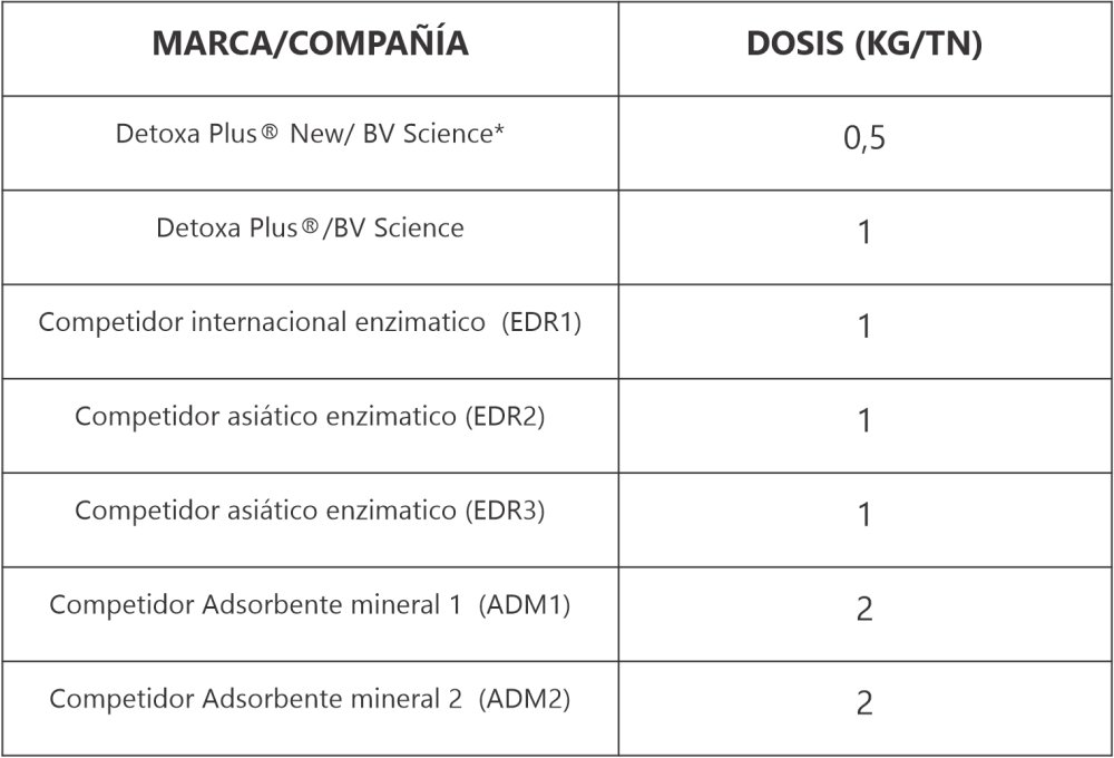 La diferencia de eliminación total de DON y ZEA entre Detoxa Plus® y el resto de los productos ocurre debido a las enzimas de Detoxa Plus® que comienzan a trabajar a pH ácido (estómago), lo que le permite un mayor tiempo de acción total. El resto de los productos aumenta su velocidad de acción con la llegada al intestino, aunque para entonces el alimento pasa menos tiempo y comienzan a absorberse las micotoxinas.