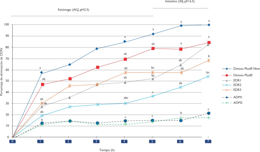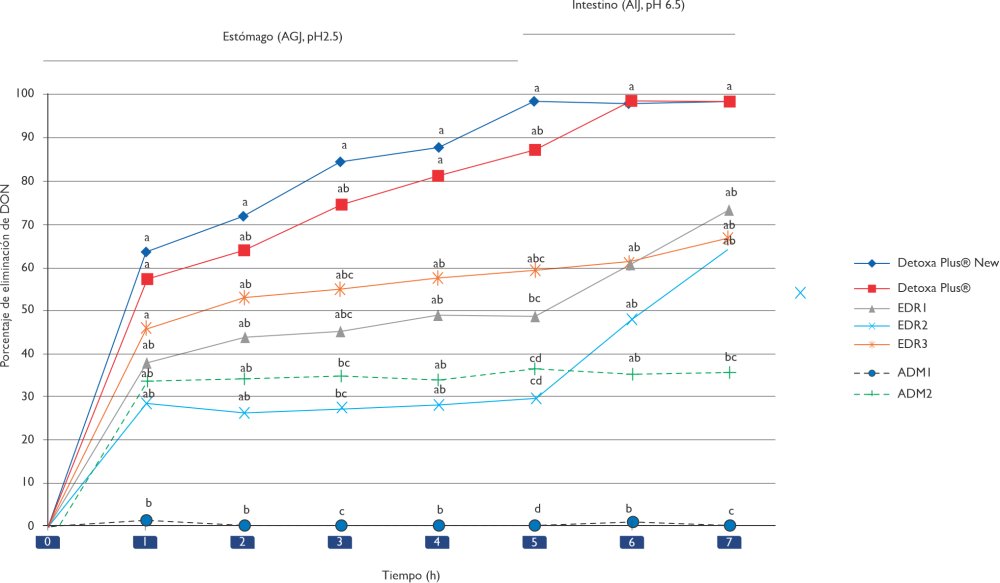 Cuando se evalúa Detoxa Plus® se observa el % de eliminación de DON (1000 ppb) en estómago a pH 2.5 durante 5 horas del 79 %, mientras que los adsorbentes minerales fueron de 12 y 13 % de eliminación a nivel estomacal.