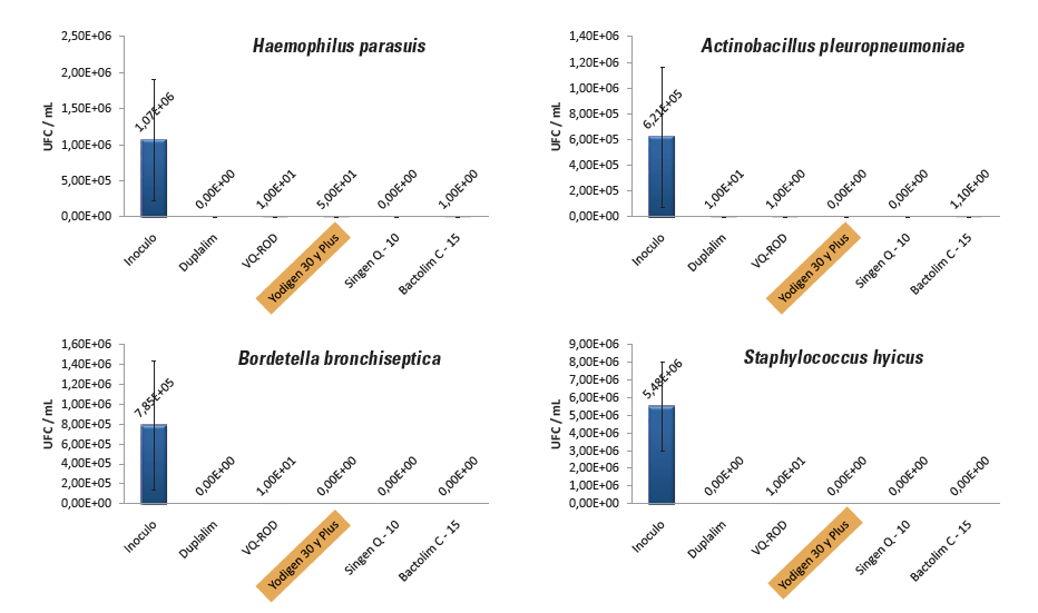 Así se puede ver en el estudio “Evaluación de la eficiencia de los 5 desinfectantes contra patógenos relevantes de la industria porcina”, realizado por Veterquimica y la Universidad de Concepción, donde se puede apreciar la eficacia bactericida de 5 productos contra los patógenos que producen el síndrome respiratorio porcino: Glaserella parauis, Actinobacillus pleuropneumoniae, Bordetella bronchiseptica, Staphylococcus hyicus y Streptococcus suis. Como se puede apreciar en los gráficos, Singen® Q–10, Bactolim®C–15 y Duplalim® fueron capaces de eliminar completamente la carga bacteriana contra los todos los patógenos utilizados en el estudio. En el caso de Yodigen® 30 y Plus logro ser eficaz contra A. pleuropneumoniae, B. bronchiseptica y S.hyicus , mientras que para el caso de S. suis y G. parasuis, disminuyo la carga bacteriana en 5 y 6 órdenes de magnitud respectivamente. Por su parte VQ-ROD® RED disminuyo la carga bacteriana entre 5 y 6 órdenes de magnitud dependiendo del patógeno y el inoculo inicial utilizado.