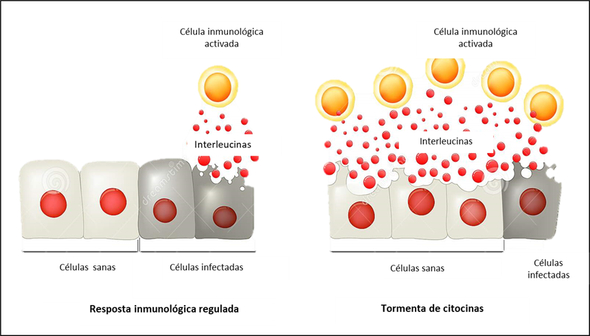 Varios estudios científicos (Teijaro et al, 2017; Basler et al, 2017; Zhu et al, 2019; Wang et al, 2020) reportan la patogénesis del virus ligada a la alta producción de interleucinas proinflamatorias, producidas por monocitos infectados y macrófagos que constituyen el evento denominado “tormenta de citocinas”, que los investigadores consideran el corazón de la enfermedad y la causa inicial de alta mortalidad.