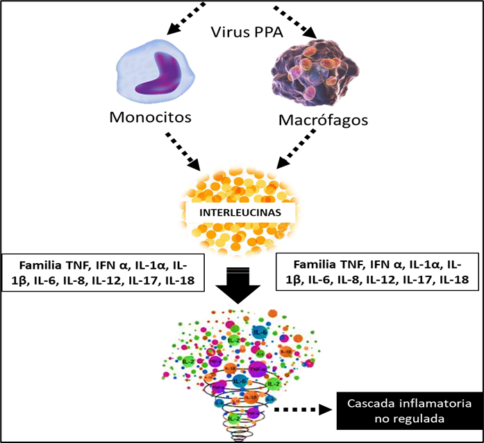 El virus de la PPA infecta predominantemente a monocitos y macrófagos (Sánchez et al., 2012) que son células que tienen una función crítica en el sistema inmunológico, ya que pueden iniciar la respuesta inmune secretando interleucinas y llevando a cabo la eliminación de patógenos mediante fagocitosis (Reis et al. al 2017).