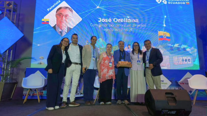 Uno de los momentos más emotivos del evento fue el reconocimiento especial a José Orellana, consultor porcino y exdirector ejecutivo de ASPE, cuya trayectoria destacada en el asesoramiento técnico y estratégico a empresas del sector, ha sido un referente en el fortalecimiento de la porcicultura ecuatoriana, aportando conocimiento, visión empresarial y compromiso con la mejora continua del gremio.