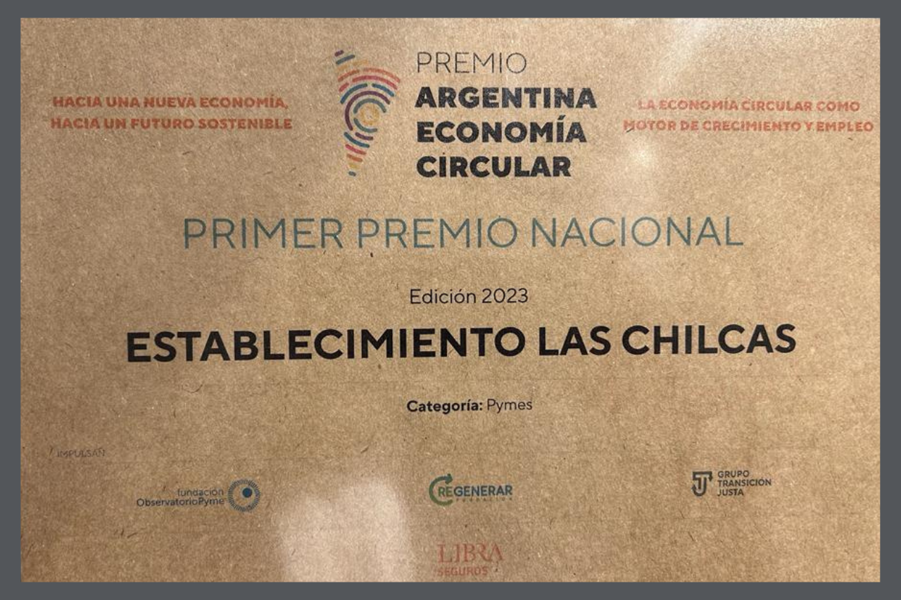 05-jul-2023 (hace 2 años 5 meses 14 días)El 3 de julio de 2023 se llevó a cabo la premiación de la primera edición "Argentina Economía Circular" la cual se trata de una distinción para reconocer a los líderes de la economía circular que promueven una transición económica justa y sostenible. En esta oportunidad, "Las Chilcas", recibió el premio en la categoría PyME (Pequeña y Mediana Empresa).