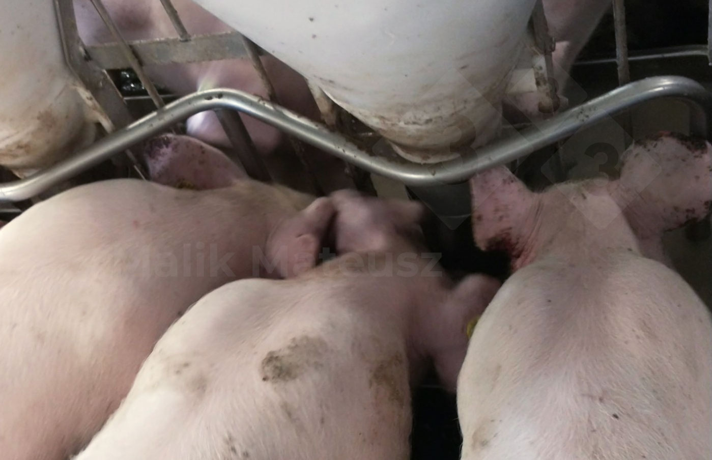 Este tipo de mordedura puede ocurrir cuando el espacio en el comedero es limitado o cuando el suministro de alimento no es suficiente. Hipotéticamente, esta agresión relacionada con el comedero puede persistir en la fase inicial de engorde si problemas similares ya estaban presentes durante el periodo de transición. No es raro que los lechones importados a granjas de engorde en Polonia lleguen con lesiones auriculares, ya sean recientes o cicatrizadas; estas lesiones suelen resolverse en aproximadamente tres semanas. Sin embargo, en algunos corrales individuales, el problema puede persistir por un periodo más largo.