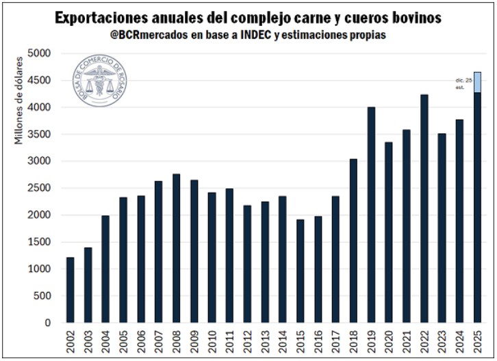 Sin embargo, el fuerte aumento de precios permitió que el valor exportado del complejo de carne y cueros bovinos alcanzara niveles récord. Entre enero y noviembre sumó USD 4269 millones, superando ya los valores anuales de 2024 y 2022. Con la estimación de diciembre, se proyecta que en 2025 el total exportado alcance USD 4600 millones, estableciendo un nuevo máximo en dólares corrientes.
