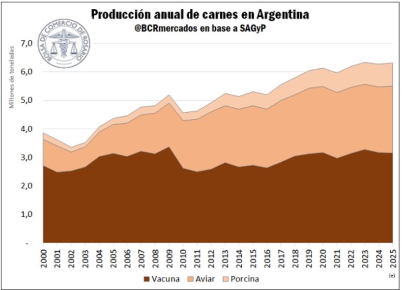 Al consolidar las cifras de los tres complejos, se proyecta que Argentina finalice 2025 con una producción total de 6,3 Mt de carne bovina, porcina y aviar. Este volumen representa un crecimiento del 0,5 % interanual y se ubica 1,9 % por encima del promedio del último lustro, consolidando una tendencia positiva de largo plazo. Mientras la producción bovina muestra una relativa estabilidad, el crecimiento de la carne porcina (+3,0 %) y la recuperación del sector aviar (+2,2 %) explican el aumento del total agregado.