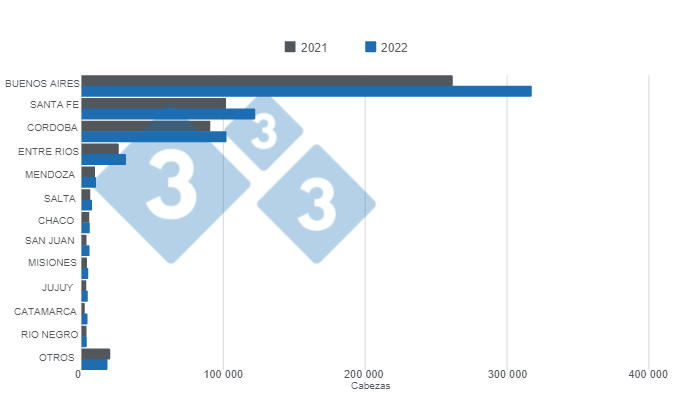 • Los resultados por provincia indican que Buenos Aires participó con el 50% de la faena, alcanzando 317 085 cb, lo que a su vez representa un crecimiento de 21% en comparación a enero de 2022 (261 392 cb). Por su parte, Santa Fe y Córdoba, cuyas participaciones fueron de 19% y 16%, ostentaron crecimientos del 20 y 13% en su orden.