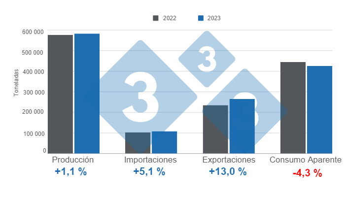Sin embargo, el leve aumento de la producción y las importaciones contribuyeron a que el cálculo del consumo aparente resultara menor al estimado para 2022, lo que podría indicar cierta contracción en la demanda interna.