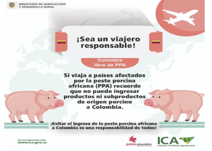Finalmente, los funcionarios del ICA que se encuentran en los Puertos, Aeropuertos, Pasos Fronterizos, PAPFs, están facultados para inspeccionar todo tipo de equipaje y decomisar productos o subproductos de origen porcícola y realizar su destrucción final.