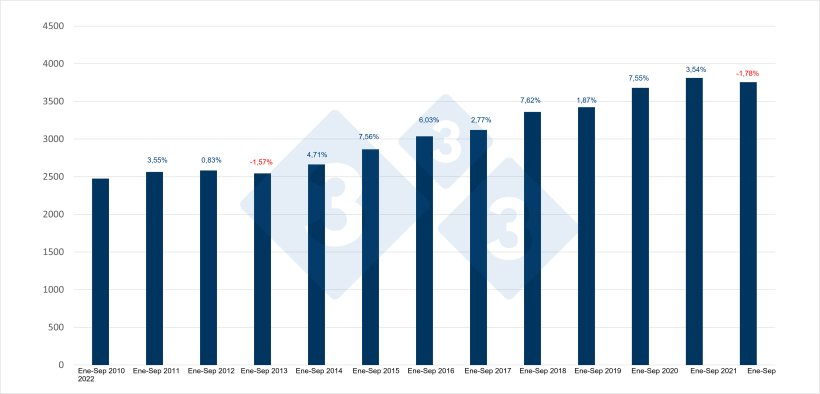 Después de varios años de aumentos ininterrumpidos, para el periodo comprendido entre enero y septiembre de 2022, la producción de carne de cerdo en España disminuyó y se situó en las 3 755 670 toneladas, un 1,78% menos que en el mismo periodo del año anterior, cuando se produjeron 3 810 670 toneladas.