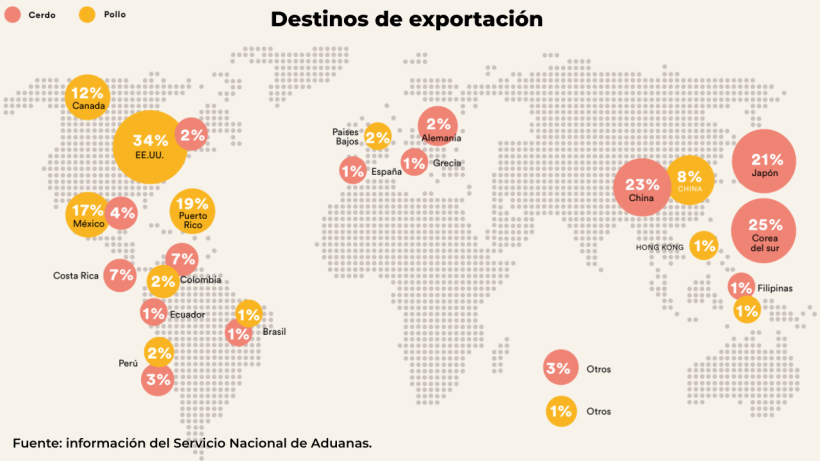 En el mercado global, el éxito comercial del cerdo chileno se sustenta en su fuerte posicionamiento en Asia. Los principales destinos de exportación porcina en 2025 fueron China (34 %), Corea del Sur (25 %) y Japón (12 %), contrastando con la carne de pollo, cuyos envíos se concentraron en Norteamérica y el Caribe (Estados Unidos 21 %, Puerto Rico 19 % y México 17 %).