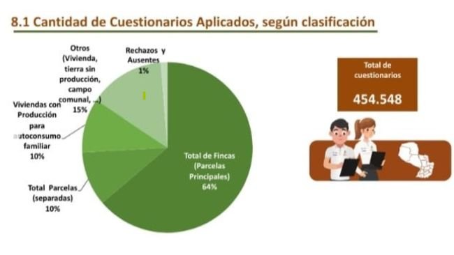 El CAN, llegó a unas 454 950 unidades observadas, de las cuales 291 497 corresponden a fincas agropecuarias productivas, totalizando una superficie total de unas 30 401 660 hectáreas, durante el relevamiento que se encaró en cuatro etapas, y duró cuatro meses, involucrando en forma directa a más de 3700 personas.