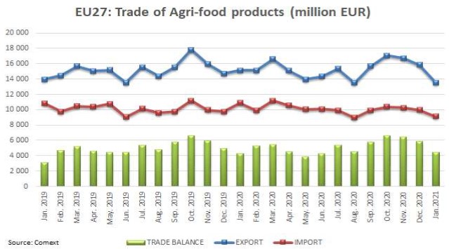 En enero de 2021, las exportaciones agroalimentarias de la UE disminuyeron un 11% en comparación con enero de 2020, alcanzando un valor total de 13.500 millones de euros. Las importaciones alcanzaron un valor de 9.100 millones de euros, un 16% menos que en enero de 2020, este descenso se produce tras un período prolongado de aumento continuo de las exportaciones. Esto dio lugar a un superávit comercial agroalimentario para enero de 2021 de 4.400 millones de euros, un aumento del 3,6% en comparación con enero de 2020.