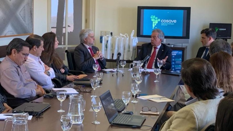 Diego Quiroga, director nacional de protección Vegetal del Servicio Nacional de Sanidad y Calidad Agroalimentaria (Senasa) de Argentina y presidente saliente del Cosave, entregó el mando al director general de Servicios Agrícolas del Ministerio de Ganadería, Agricultura y Pesca de Uruguay, Leonardo Olivera Uriarte.