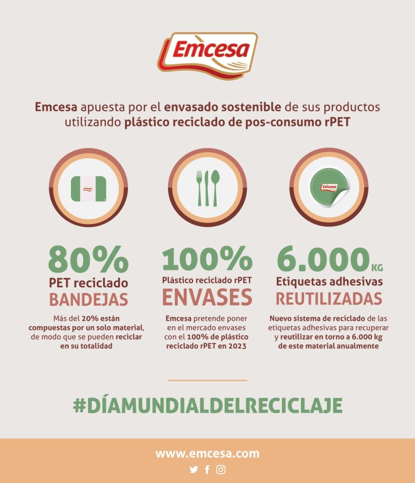 Emcesa comenzó a utilizar esta nueva tecnología en 2015, incrementando paulatinamente el porcentaje de material reciclado. A día de hoy, el 81,5% de las bandejas utilizadas contienen al menos un 80% de PET reciclado. Adicionalmente, de estas bandejas, más del 20% están compuestas por un solo material, de modo que se pueden reciclar en su totalidad.